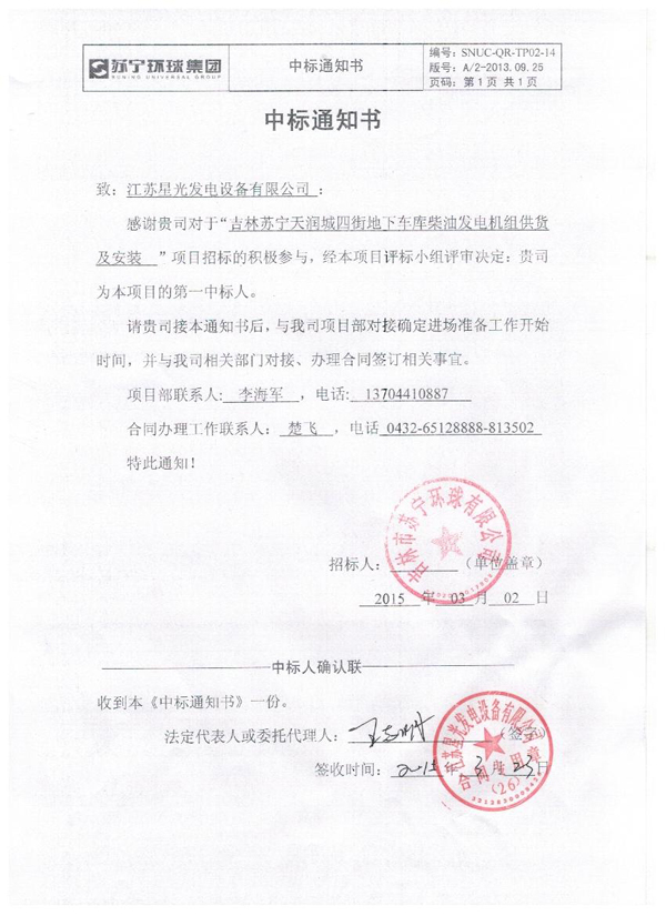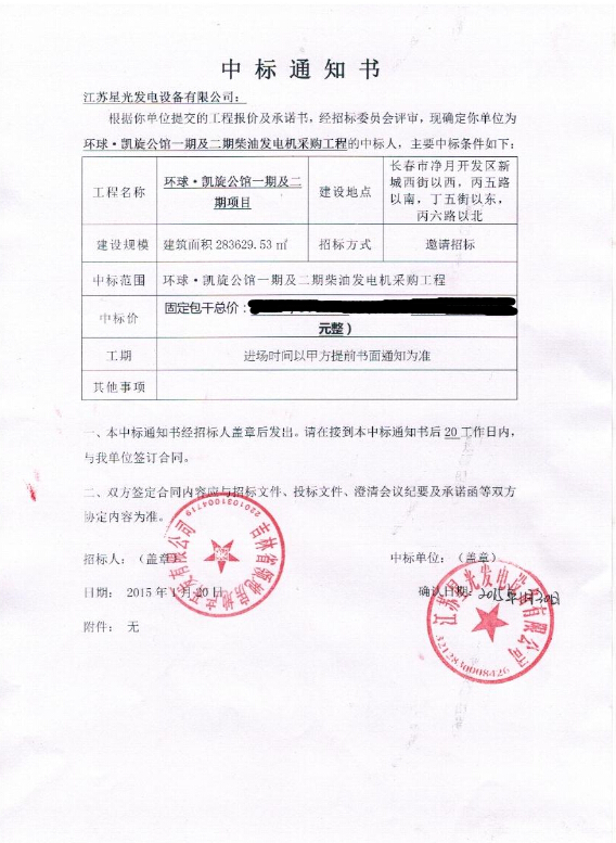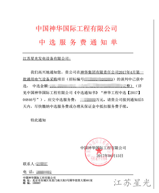 中國神華國際工程有限公司發(fā)電機組采購中標通知書
