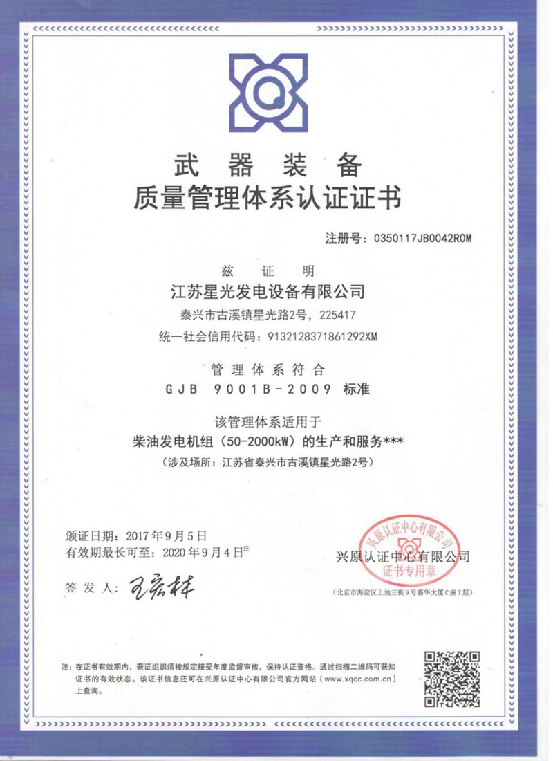 武器裝備質(zhì)量管理體系認(rèn)證證書
